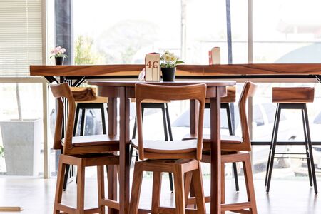Picture of cafe interior with wooden table and chairs