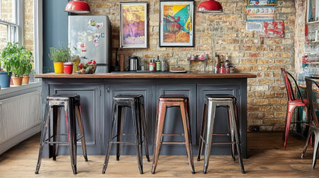A beautifully designed kitchen showcasing a rustic charm with an exposed brick wall, wooden countertop, stylish bar stools, and vibrant decor, ideal for any home.