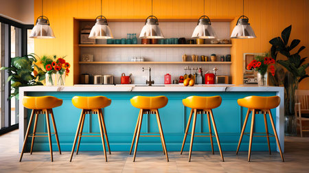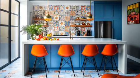 Explore a chic urban kitchen with vibrant colors stylish furniture and inviting atmosphere.