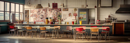 An empty school canteen with large windows