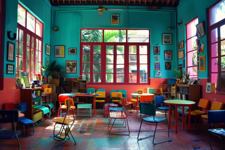 The bright classroom features an array of colorful chairs and tables, adorned with art and framed pictures, creating an inspiring space for students to engage and learn.