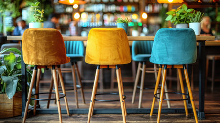 Three barstools in vibrant colors stand at a cafe counter.
