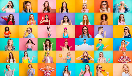 Collage of portraits of young people isolated over multicolored backgrounds. Concept of emotions, facial expression, fashion, beauty.