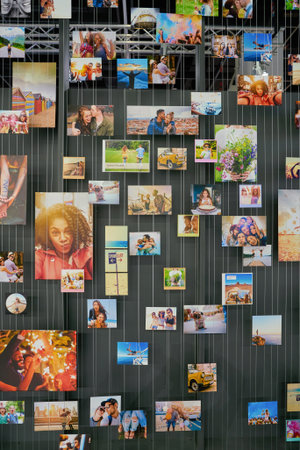 Abstract background of many photos on a wall. Focus on the foreground.