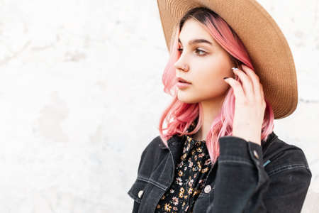 Fresh portrait fashionable young woman with pink amazing hair in stylish straw hat in denim trendy jacket near white vintage wall in city. Fashion model gorgeous beautiful girl enjoy summer on street