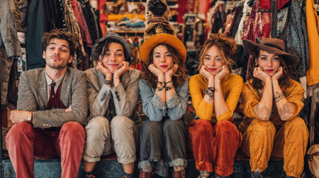 A diverse group of young adults sitting in a vintage clothing store, embracing friendship and sustainable fashion with their unique and stylish outfits.