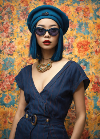 Vibrant fashion portrait with retro glasses and bold patterns.
