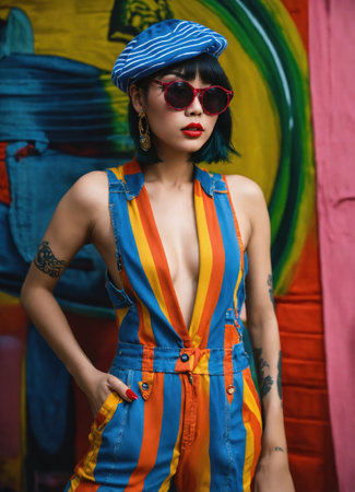 Young woman with glasses poses confidently against a colorful urban mural in bright yellow and blue attire. Generative AI