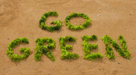 GO GREEN Text made with green seaweeds on a beach in Sanur, Indonesia