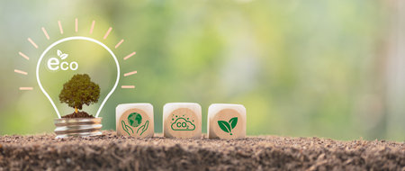 Eco, green words with leaf symbol on wooden cube blocks on brown wood desk and green nature background with copy space. Green energy, Ecology, eco friendly concept.