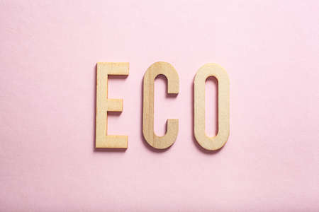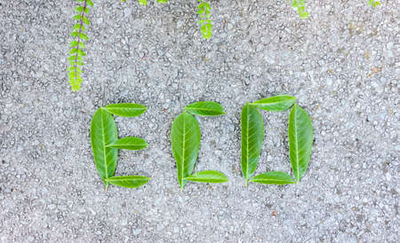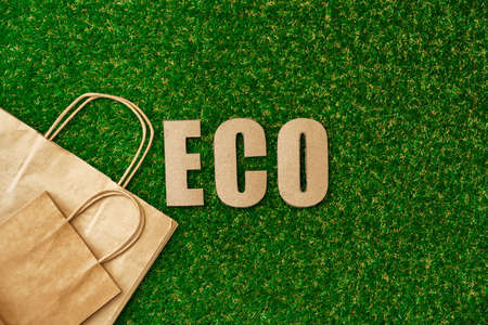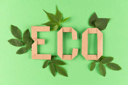 Sustainable lifestyle and zero waste concept. Text ECO made with kraft paper letters and green leaves around, quote over green background. Environmental problems and solutions. Flat lay