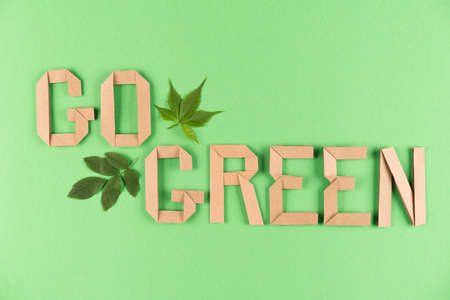 Sustainable lifestyle and zero waste concept. Text GO GREEN made with kraft paper letters and green leaves around, quote over green background. Environmental problems and solutions