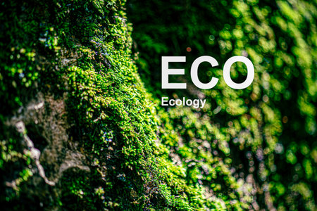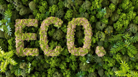 This vibrant image features letters formed from lush moss, symbolizing a commitment to ecology and sustainability, surrounded by rich greenery.