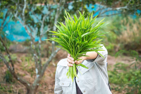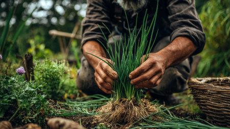 A dedicated gardener carefully cultivates fresh green chives in a lush garden, showcasing the beauty of nature and the joy of growing plants.