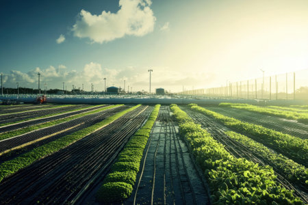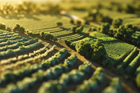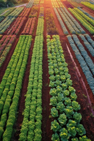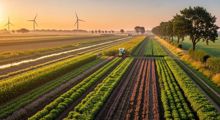 Golden sunrise illuminates vast agricultural fields with meticulously arranged rows of diverse crops and colorful...