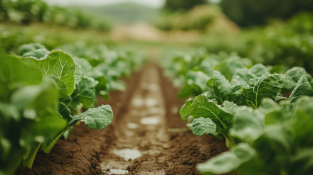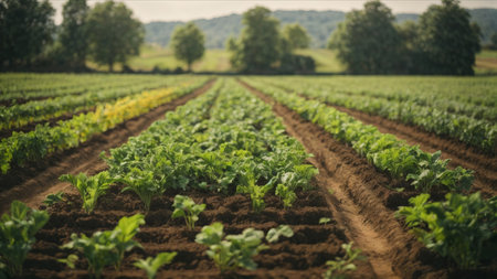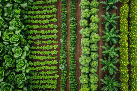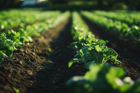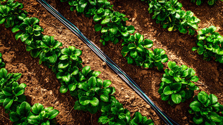 Straight rows of lush green vegetables thrive in a garden, illuminated by daylight, highlighting healthy growth and soil quality.