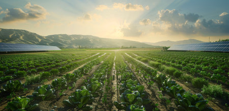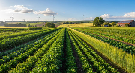 Sustainable agriculture landscape. Green fields and renewable energy. Farming and clean power.