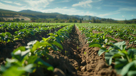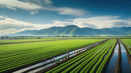 This stunning image captures a vibrant green crop field adorned with neat rows under a bright blue sky, framed by majestic mountains in the distance.