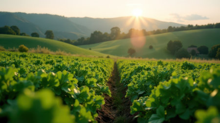 A lush green field of crops stretches out into the distance, with a warm sunset casting a golden glow over the scene. The rolling hills in the background add to the beauty of this tranquil landscape.