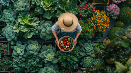 An aerial view of a gardener with a wooden basket full of colorful fresh vegetables