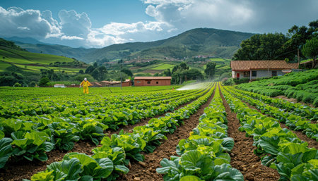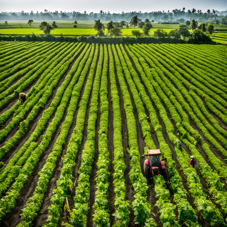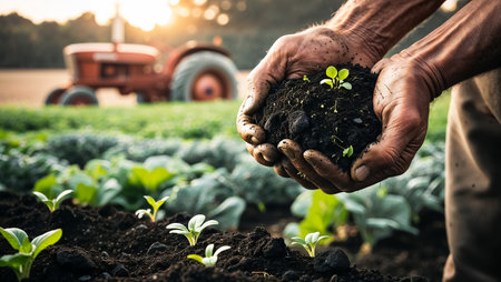 An expansive view of a meticulously cultivated agricultural landscape. Various crops are planted in distinct, orderly rows, showcasing a spectrum of greens and yellows. In the foreground, a farmer's hands are actively working with rich brown soil, highlighting the human in food production. Tractors and farming equipment are visible in the distance, indicating modern agricultural practices. The scene captures the essence of farming, from the meticulous planting to the promise of harvest,...