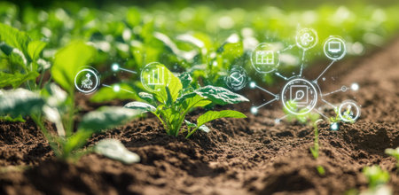 The concept of smart agriculture and digital data collection in the field with green plants growing on soil, surrounded by icons representing an agricultural technology network for satellite tracking of plant health using big data. Copy space. High quality image taken from a Canon EOS R5 camera with an F2 aperture, ISO 30, and an 80mm lens. --ar 45:22 --v 6.1 Job ID: ea6342b7-ec10-4a79-8689-188cc90780cc