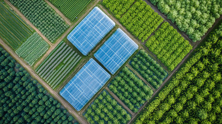 This stunning aerial image showcases a vibrant vegetable garden, meticulously arranged within a lush green landscape, promoting sustainability and natural beauty.