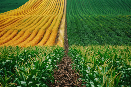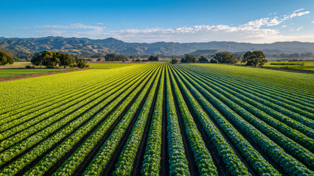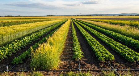 Expansive agricultural fields showcase neat rows of vibrant green crops and golden wheat under a vast sky with...