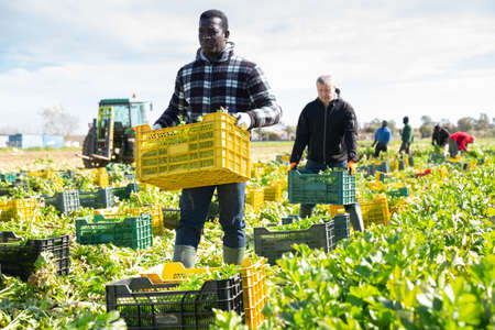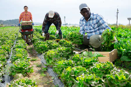 Side view portrait of two smiling workers loading harvest on cart while standing at vegetable plantation outdoors in sunlight, copy space