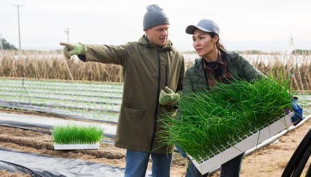 Two contemporary farmers discussing new methods of growing cabbage while moving along plantation