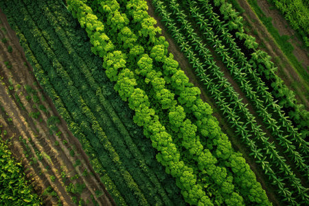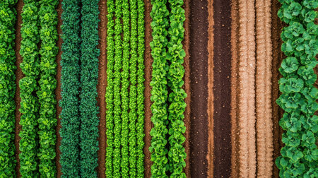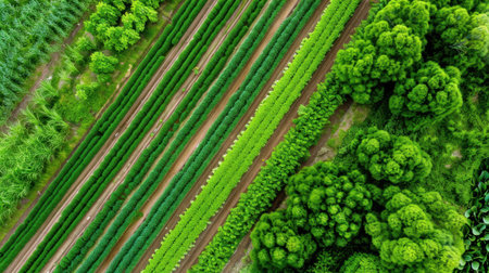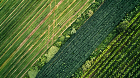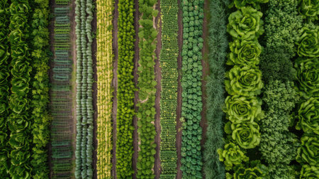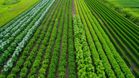 This aerial image captures the beauty of diverse green crop fields arranged in neat rows, showcasing the intricate patterns of rural agriculture.