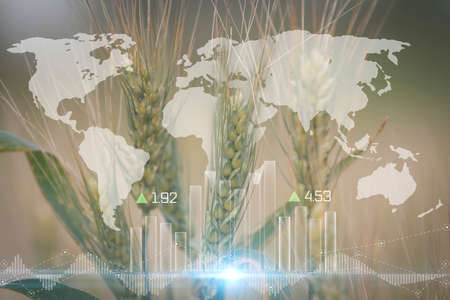 Global Food crisis with duble exposure of graphic diagrams and charts with wheat field. Embargo and sanction for export for wheat. global food security