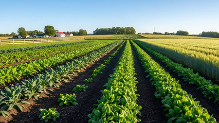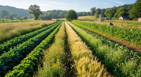 Organic showing lush organic farm with rows of diverse crops including lettuce, flowers, and corn under a bright...