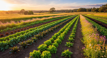 A vibrant farm field stretches into the distance, showcasing meticulously arranged rows of lush green lettuce and other vegetables. The setting sun casts a warm, golden glow across the landscape, illuminating the colorful wildflowers that dot the edges of the fields. The scene evokes a sense of abundance, healthy living, and the beauty of agricultural cultivation under a serene sky.