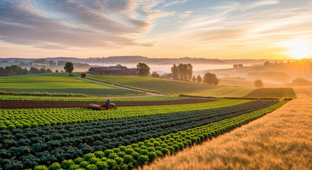 A sunrise illuminates a vast agricultural landscape. Rolling hills are covered with meticulously arranged fields of crops, including rows of green vegetables and golden wheat. In the distance, a farmer operates a tractor, tilling the soil. The warm, golden light of dawn casts long shadows and creates a gentle mist that softens the distant hills and farm buildings, conveying a sense of peace and the start of a productive day.