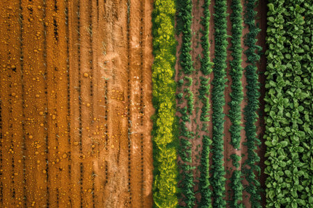 Drone view of crop rotation patterns, showcasing sustainable farming practices