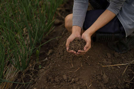 Expert farmer show soil in hand just taking from ground at agriculture fields.