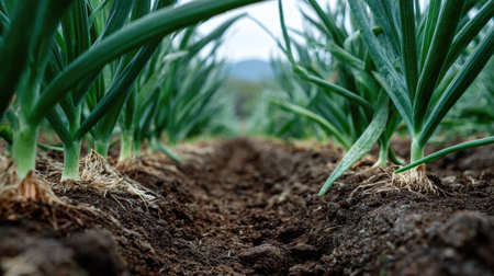 A close-up view of fresh green onions emerging from the soil, showcasing the vibrant foliage and rich soil texture in an agricultural setting.