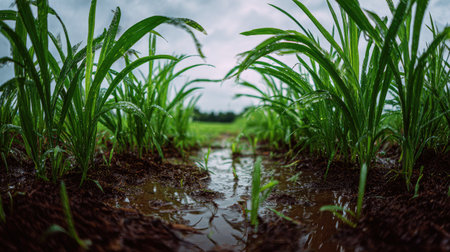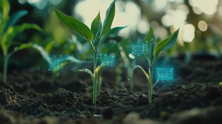 Close-up of germinating corn plants supported by digital overlays for agriculture technology, showcasing data analytics and sustainable farming methods for modern agriculture practices.