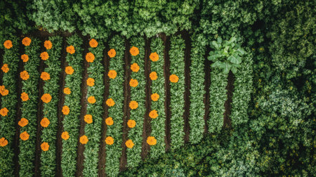 A stunning aerial view of a blooming garden showcases vibrant orange flowers amidst lush green plants. This colorful landscape highlights rural agricultural beauty.