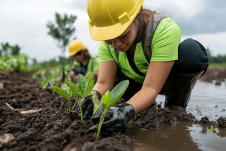 Conservation workers restore wetland habitats by planting saplings near waterbodies This vital reforestation project combats climate change, symbolizes environmental stewardship, and promotes ecological balance Images highlight the hopeful future of wetland restoration and biodiversity preservation for a sustainable planet AI Generative