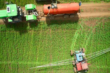 Treatment of the field with herbicides. Top view of special equipment replenishing the supply of chemical reagent. Shooting from a drone.