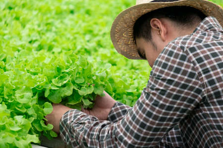 Smiling asian girl farmer holding box with harvested green lettuce on field