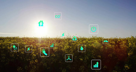 Floating icons showing renewable energy above rapeseed field at dawn symbolizing sustainability. Sustainability, conservation, eco, innovation, ecology, cleantech, ecofriendly