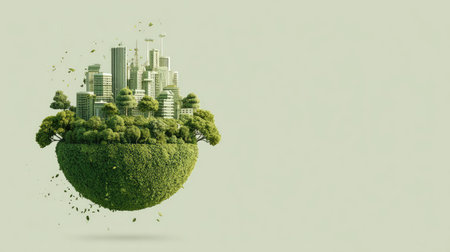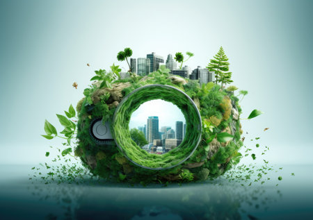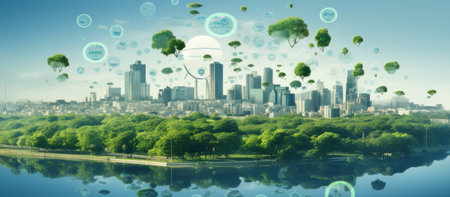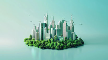 A vibrant cityscape merges with lush greenery, showcasing a harmonious blend of modern architecture and natural beauty, perfect for environmental themes.