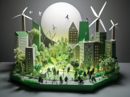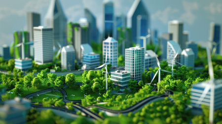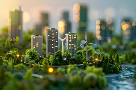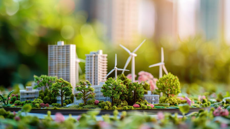 A miniature cityscape set within lush green foliage. The miniature city features several buildings and trees, as well as three small wind turbines generating clean energy. The scene is bathed in warm sunlight, suggesting a sunny day.