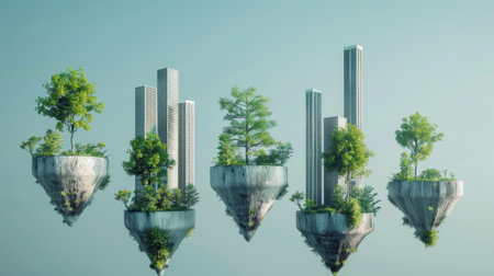 Floating Urban Skyscrapers with Lush Green Trees Illustrating. Eco-Friendly Cityscape
