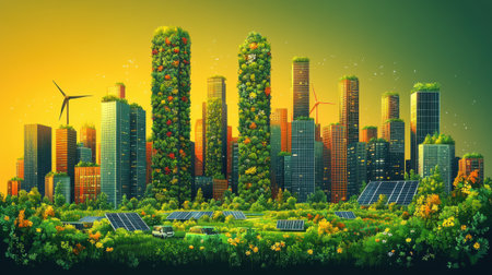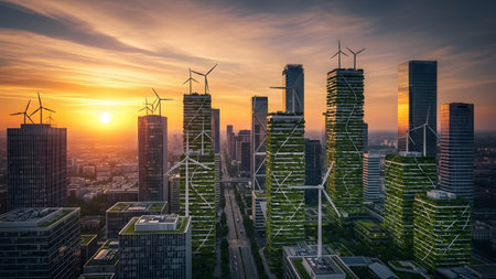 Sustainable cityscape with green skyscrapers and wind turbines illuminated by a vibrant sunset