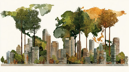 An artistic illustration presents a cityscape integrated with a stylized world map formed by trees. The composition utilizes watercolor effects with green, brown, and yellow hues, suggesting an outdoor setting. This image is suitable for environmental, ecological, and sustainable development-themed publications and visual communication projects.