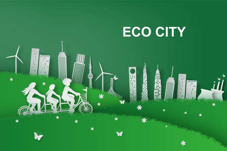 Paper art of family riding a bicycle and park on green eco city, origami paper art and cut concept. ecology idea, green city and family on poster. environment development. save the world and energy.